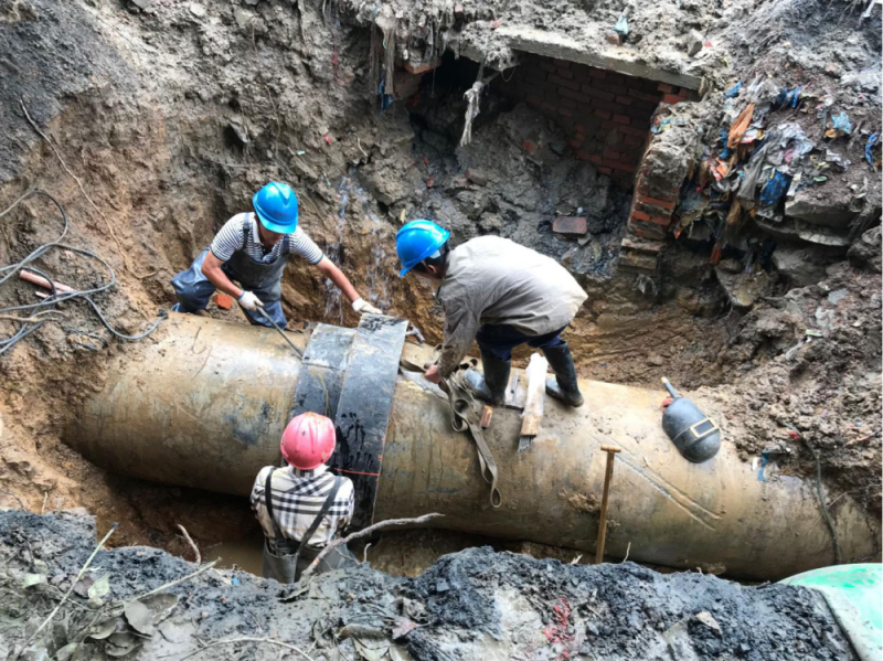 18日下午6點,DN800管道漏點終被挖出,原因是兩根水泥管道連接處經(jīng)過天長日久的熱脹冷縮而發(fā)生漏水。考慮到停水作業(yè)將會影響用戶的正常需求,在管道挖出后,搶修人員發(fā)揮分工協(xié)作的高效作風(fēng),一組進(jìn)行人工清理操作坑底和管上的淤泥,一組負(fù)責(zé)備料,一組關(guān)閘調(diào)水。下午7點,材料到位,操作坑內(nèi)5名維修人員加緊手中動作,一刻不停進(jìn)行管道清理、搶修節(jié)包裹、擰螺栓……19日凌晨,經(jīng)過14個小時的緊急搶修,DN800供水管道維修工作順利完成,主城區(qū)全面恢復(fù)正常供水。