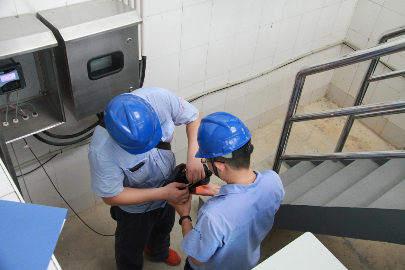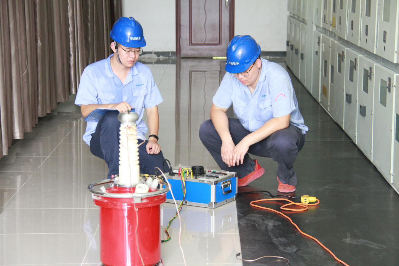 8月15日上午10點,三名維修中心工作人員在三水廠配電間對施工用的絕緣工具進行高壓試驗。維修人員告訴我們,這個作用是為了檢測絕緣工具效能是否完好,能否正常工作,如果絕緣出現問題的話,會帶來很大的安全隱患。
