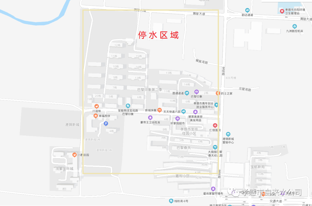 因寶成路巴黎印象供水管網碰頭,我公司將于2020年9月25日(周五)晚21:00至次日早晨8:00進行施工作業(如遇雨天,施工順延),屆時仁信醫院、巴黎印象,巴黎春天、港錦新城、寶成佳園等小區及周邊區域將暫停供水。請上述區域的客戶相互轉告,提前儲水備用,并及時檢查和關閉內部用水設施。